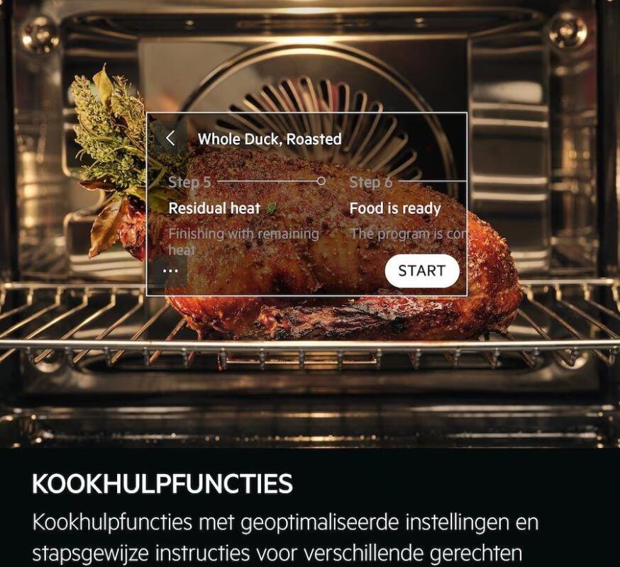 Kookhulpfuncties bieden de beste instellingen en automatische opties zoals roosteren, opwarmen en deeg laten rijzen voor uitstekende resultaten. En de functie Gerechten biedt stapsgewijze begeleiding bij het bereiden van vlees, bakken, het bereiden van plantaardige gerechten, vis of groenten.