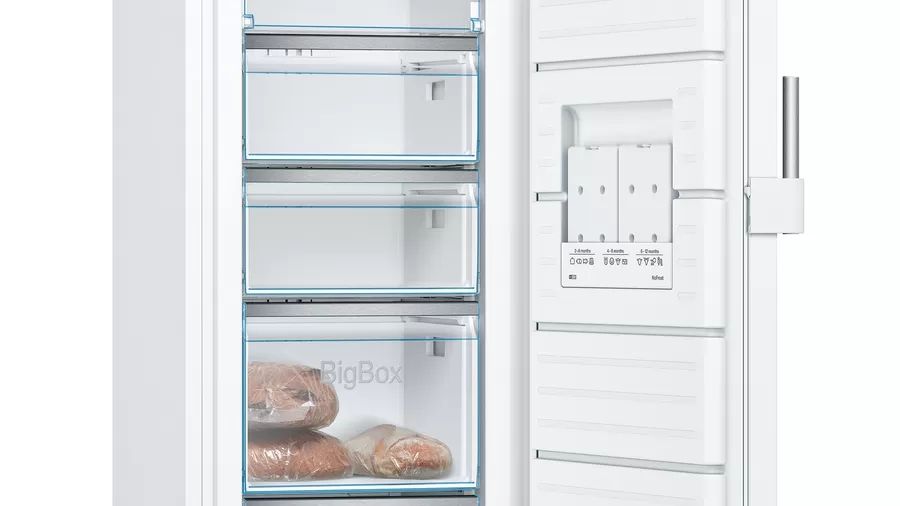 Een van de grote voordelen van de Bosch vriezer GSN33EWEV is de Vario Zone. Met uitneembare glazen plateaus kun je de binnenruimte flexibel indelen, zodat je zelfs de grootste diepvriesproducten zijn plek kunt geven. De Big Box-lade is perfect voor het stapelen van vershouddozen, waardoor alles georganiseerd blijft. Daarnaast heb je de gemoedsrust van een optisch en akoestisch alarm dat je waarschuwt als de deur niet goed gesloten is.