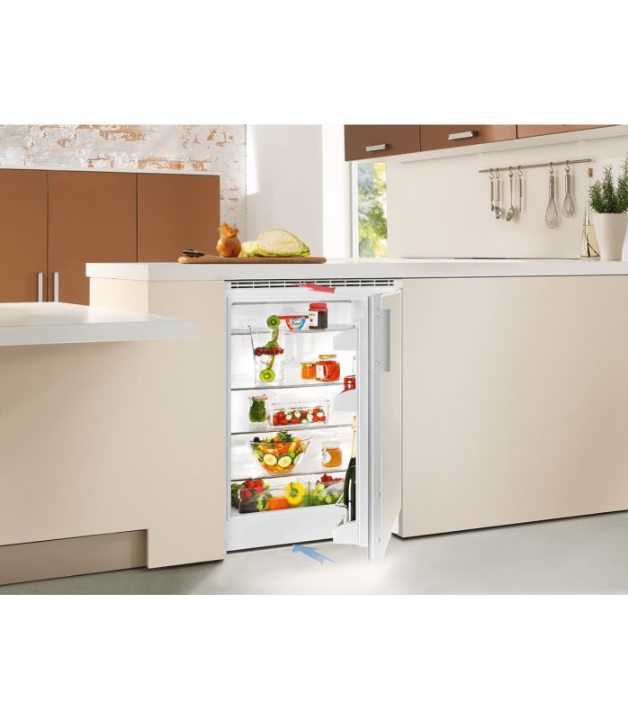 De Liebherr UK 1720 onderbouw koeler is voorzien van witte decorlijsten waartussen een decorplaat van max. 4 mm dikte te plaatsen is. Dankzij de plintbeluchting en het ventilatierooster op de bovenzijde kan deze koeler onder elk werkblad worden geplaatst.