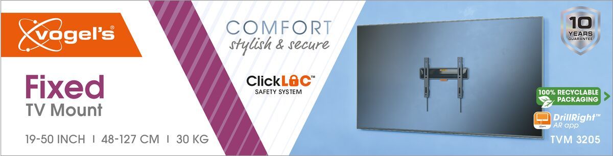 De COMFORT Fixed tv beugel installeren is eenvoudig. Alles staat helder uitgelegd in de bijgeleverde Quick Installation Guide. Online kun je ook de uitgebreide handleiding of de installatievideo bekijken. Een boormal, schroeven en fischer® DuoPower pluggen zijn bijgesloten en de beugel zelf heeft een ingebouwde waterpas. Met onze gratis DrillRight™ AR App teken je eenvoudig je eerste boorgat af.